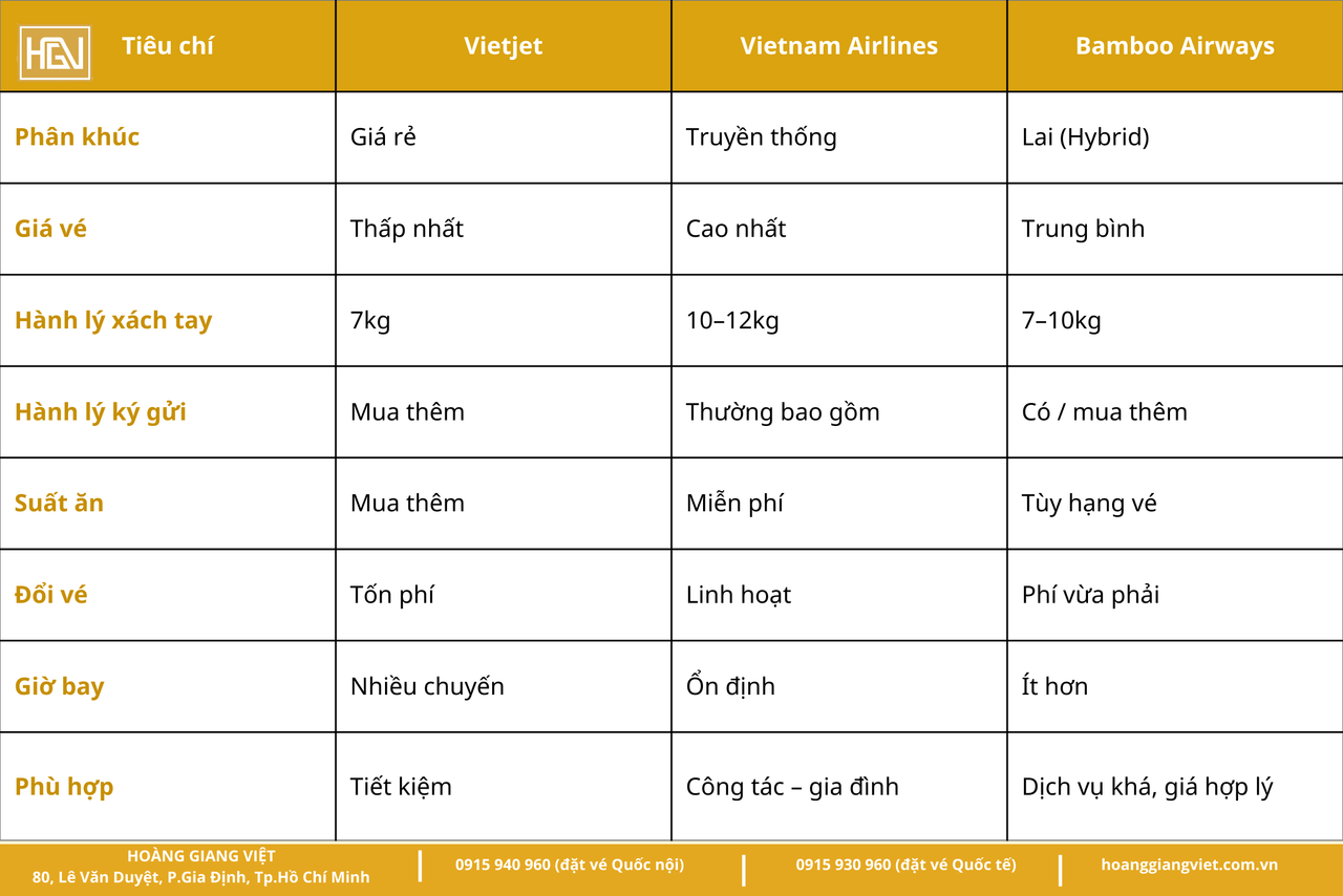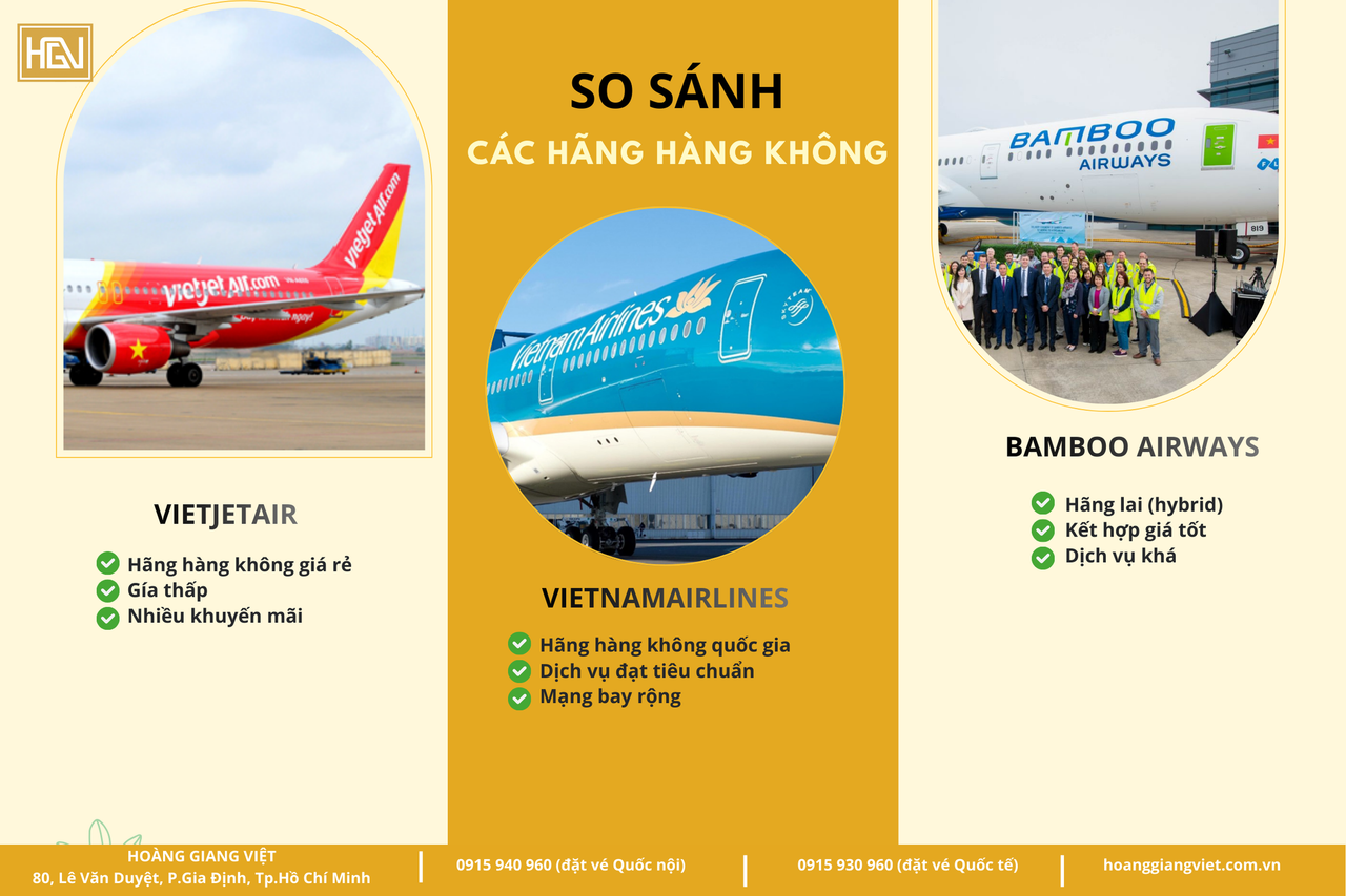 Trong bài viết này, Hoàng Giang Việt sẽ so sánh chi tiết Vietjet – Vietnam Airlines – Bamboo để bạn dễ dàng lựa chọn hãng bay phù hợp nhất với nhu cầu và ngân sách của mình.